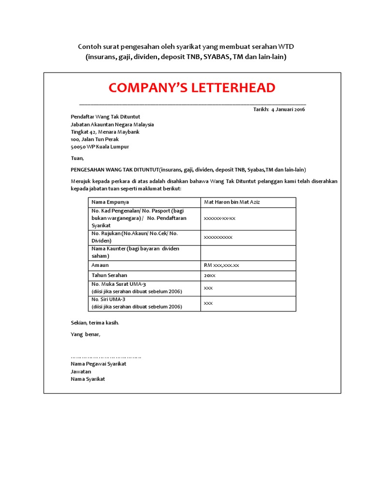 6 1 Contoh Surat Pengesahan Bagi Wtd Insurans Gaji Dividen Deposit Tnb Syabas Tm Dan Lain Lain Pdf